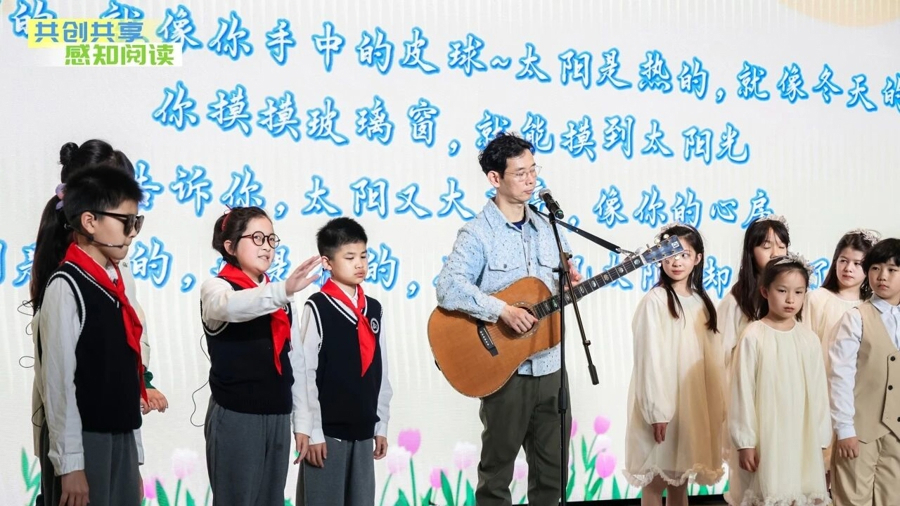 活动一开始,上海童谣唱作人王渊超、主持人李欣便与上海市盲童学校四位同学、上海市实验学校国际部童声合唱团,以及手语翻译陈伊佳,共同带来了融合共创节目《做生活的诗人》,沪语的软糯、童谣的轻快、手语的翻译、合诵的共振以及现场灯光的聚焦……多种“语言”的交织,不仅为活动带来了一场别开生面的开场,更让观众可以沉浸式调动全身心去感知最是书香的美好与力量。